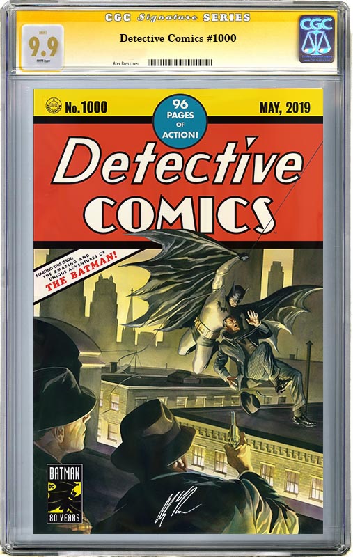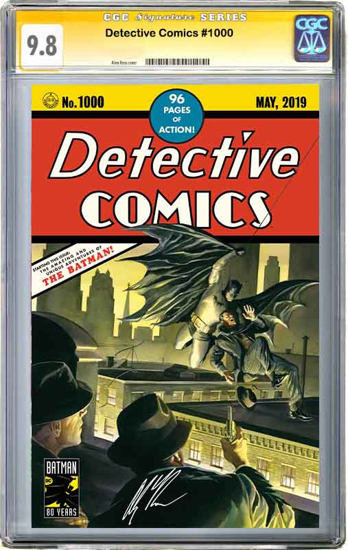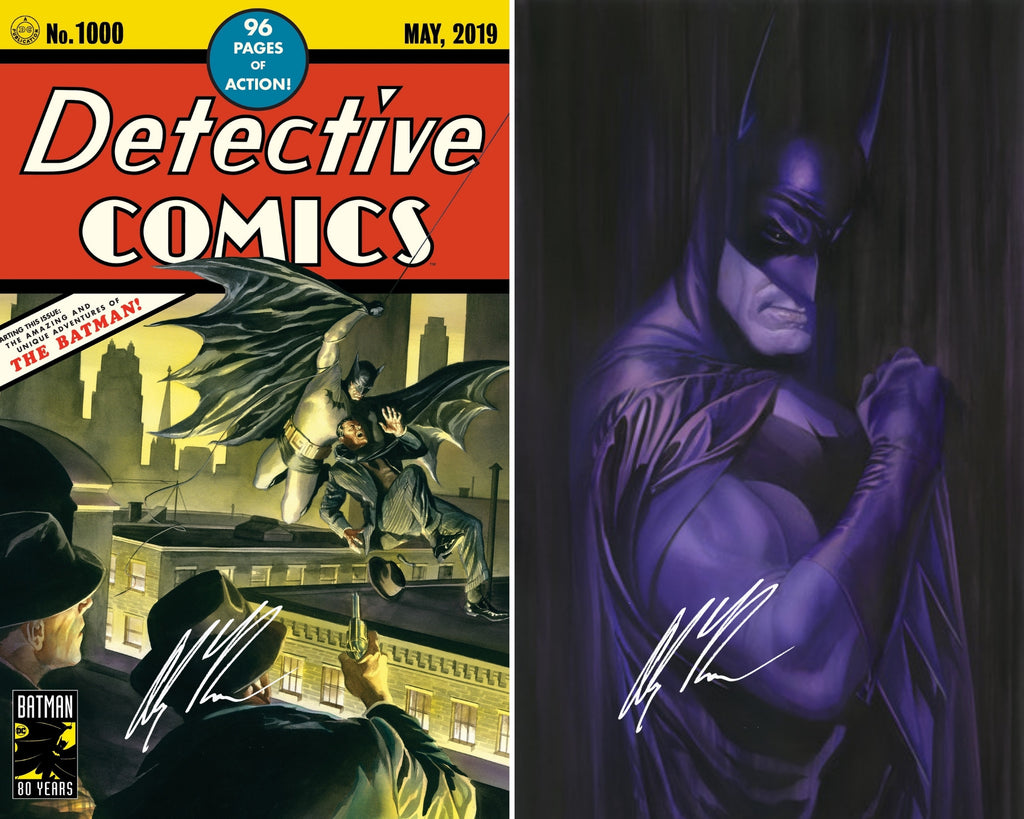 For this milestone anniversary, Alex Ross created an all-new Batman painting—his stunning recreation of the original first appearance of The Batman from 1939's DC Comics, Detective Comics #27. It is presented here in an exclusive variant cover with vintage-style trade dressing just as released 80 years ago.