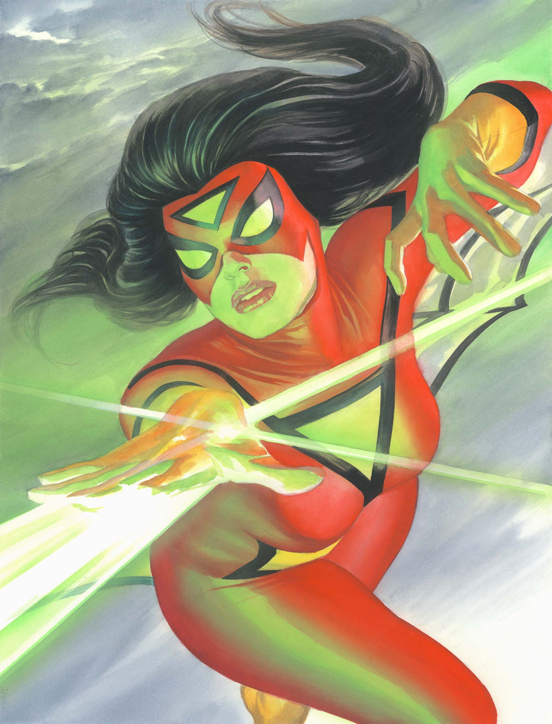 "Spider-Woman" is an original, one-of-a-kind gouache painting on 3-ply Strathmore illustration board, sized 15 x 19 inches, and represents Ross’s definitive reinterpretation of legendary Marvel characters. These works were painted specifically for the book and have never been offered before. Signed by the artist.